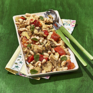 Imagine you’re in a stunning Tuscan villa overlooking the Chianti hills, the late afternoon sun beating down while the swifts and swallows play overhead. You need a salad to go with that freshly roasted chicken. This is the one. Charred artichokes, cannellini beans, red peppers, fresh oregano, olive oil. Happy days. Salad days.