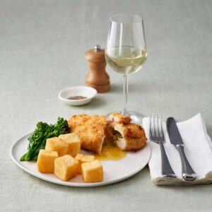 Fresh prepared English chicken breast, Garlic, Unsalted Herb butter, Flour (GLUTEN), EGGS, MILK, Parsley, Panko Breadcrumbs [WHEAT flour, (GLUTEN), salt, yeast, enzyme, soy oil (SOYA)], & seasoning