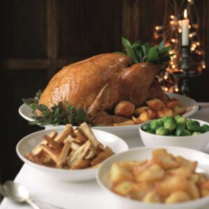 Preheat oven to 180C. Cook for 35-40 mins per kilo plus an additional 20 mins. Allow the bird to rest by covering in tin foil for 20 minutes. Any juices that escape the bird should be poured into the gravy. Serve with our Pommes Chateaux and Brussels Sprouts – and don’t forget the Trimmings!