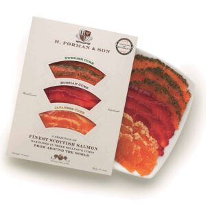 We use Grade One Scottish Salmon and apply three different cures: Swedish, a classic with dill and a hint of star anise; Russian, subtly flavoured with wildly coloured with beetroot; and Japanese, wasabi and ginger-infused for those who like Asian flavours. Our Mixed Selection Pack contains all three flavours, which makes it fantastic for a dinner party when guests can pick a favourite.