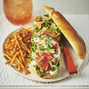 Cooked Lobster Meat (CRUSTACEANS), Cherry Tomato, Mayonnaise (Free range EGG, Vinegar, Rapeseed Oil), CELERY, Pea Shoots, Cayenne Pepper, Salt & Pepper