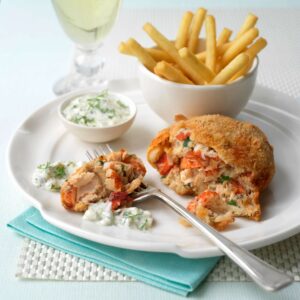 Lobster & Salmon: Fresh Scottish Salmon (FISH), Lobster (CRUSTACEANS), Potato, Free Range EGGS, Panko breadcrumbs [Gluten Free Flour, Salt, Yeast, Enzyme, Soy Oil (SOYA)] herbs, MILK, Salt & Pepper