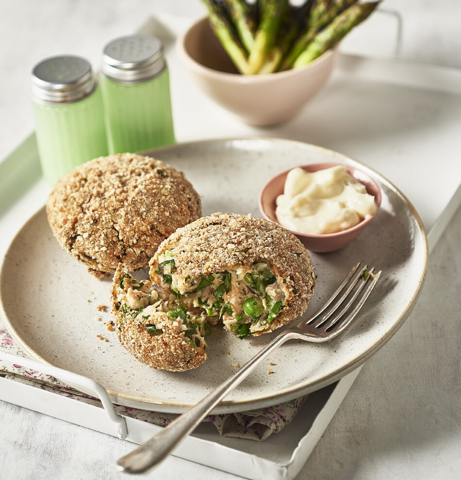 Salmon, Pea & Chive: Salmon (FISH), Potato ,Garden Peas, Chives, Free Range EGGS, (MILK), Panko Breadcrumbs [Gluten Free Flour, Salt, Yeast, Enzyme, Soy Oil (SOYA)], Salt & Pepper