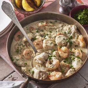 An elegant seafood dish, crafted by the chefs at Forman & Field. Succulent pieces of monkfish and plump prawns are gently simmered in a rich vermouth cream sauce, delicately infused with sliced onions and fresh chervil for a fragrant, balanced finish.Luxurious yet comforting, this classic French-inspired fricassée celebrates the best of British seafood with refined simplicity.